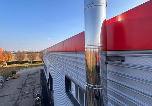 La fourniture et l'installation comprenaient 5 cheminées ICS 5000 Ø350, qui desservent les groupes électrogènes (Gen Sets) fournissant l'énergie de secours au centre de recherche. L'une des principales exigences était de minimiser l'impact visuel des cheminées au-dessus du niveau du toit afin de préserver l'esthétique du bâtiment. Pour ce faire, l'armature et l'enveloppe extérieure des cheminées ont été sablées, un processus qui leur a permis de se fondre parfaitement dans la structure environnante, assurant à la fois la fonctionnalité et l'harmonie visuelle avec l'architecture existante.