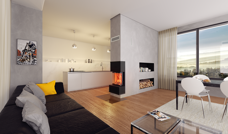 Trójstronny wkład kominkowy z całkowicie niezależnym obiegiem powietrza przy jednoczesnej pracy kontrolowanego systemu wentylacji pomieszczenia.