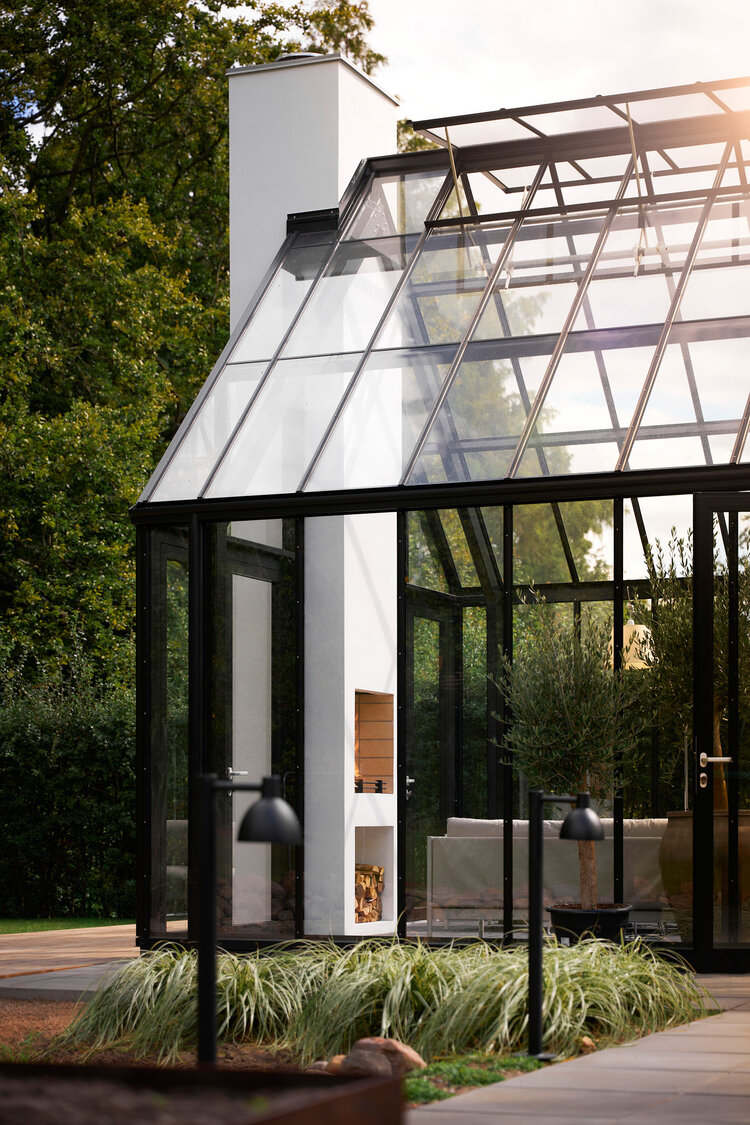 Det nya rummet var tänkt som mer än bara en tillbyggnad. Det skulle vara en plats familjen kan använda under årets ljusa månader, men också ett rum som fungerar när det är kallt ute. Därför uppstod idén att tillföra eld som ett fjärde element. Tillsammans med ljus, vatten och natur gör det vinterträdgården till ett rum som kan användas året runt.