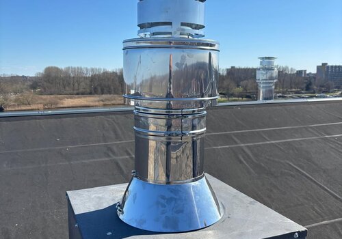 We leverden en installeerden vijf ICS 5000 Ø350 systeemschoorstenen voor de back-up generatorsets in het onderzoekscentrum. Een belangrijke uitdaging was om de visuele impact op de esthetiek van het gebouw te minimaliseren. Om dit te bereiken werden het frame en de buitenmantel van de schoorstenen met soda gestraald, een proces dat ervoor zorgde dat ze naadloos opgingen in de omringende structuur, waardoor zowel de functionaliteit als de visuele harmonie met de bestaande architectuur werd gewaarborgd.